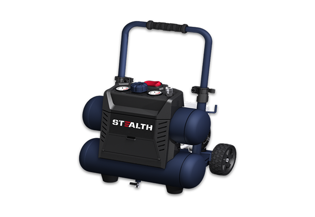 The twin air tanks means less time spent refilling and more time working. Its compact size (20 inch / 16 inch / 22 inch) and upright design takes up less worksite space. What’s more, Stealth’s unique design means you get all this without the noise of other commercial air compressors.